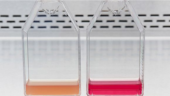 被细菌污染的培养基(左)呈浑浊和黄色,而未受污染的培养基(右)则呈透明和红色。发布者:李涵 SA21168071